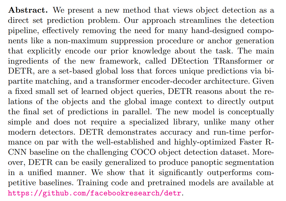 In essence, the abstract presents DETR as an elegant and powerful alternative to the complex, hand-tuned pipelines that have long dominated object detection.