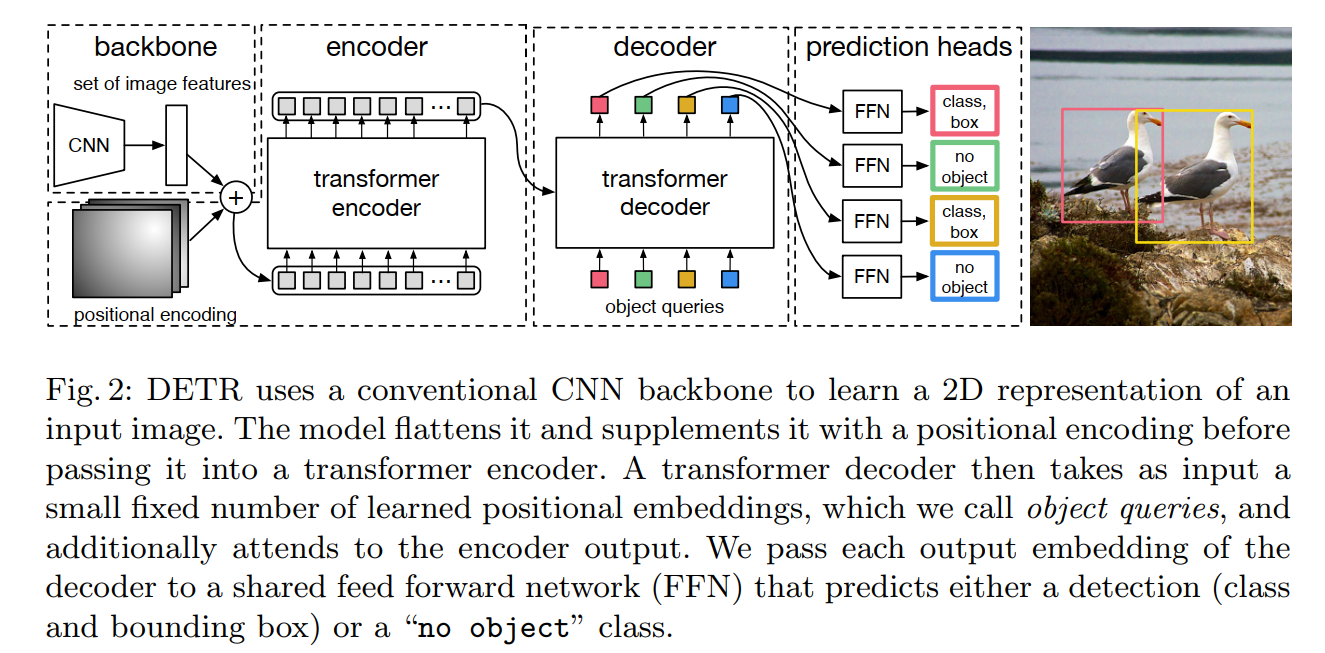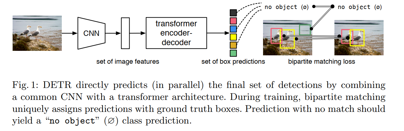 Our DEtection TRansformer (DETR, see Figure 1) predicts all objects at once, and is trained end-to-end with a set loss function which performs bipartite matching between predicted and ground-truth objects.