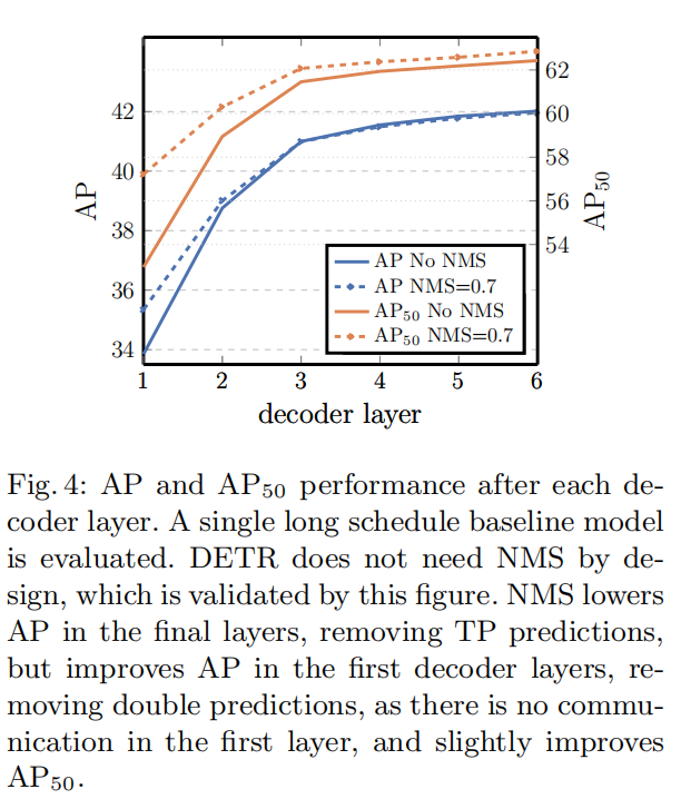 - NMS helps the predictions from the early decoder layers but hurts the predictions from the final layers.
