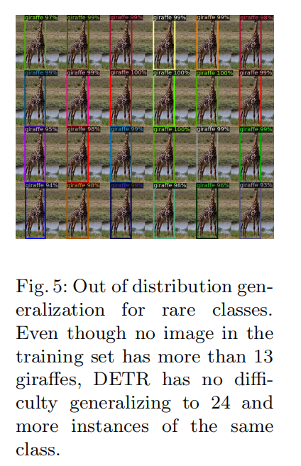 We create a synthetic image³ to verify the generalization ability of DETR (see Figure 5). Our model is able to find all 24 giraffes on the image which is clearly out of distribution. This experiment confirms that there is no strong class-specialization in each object query.