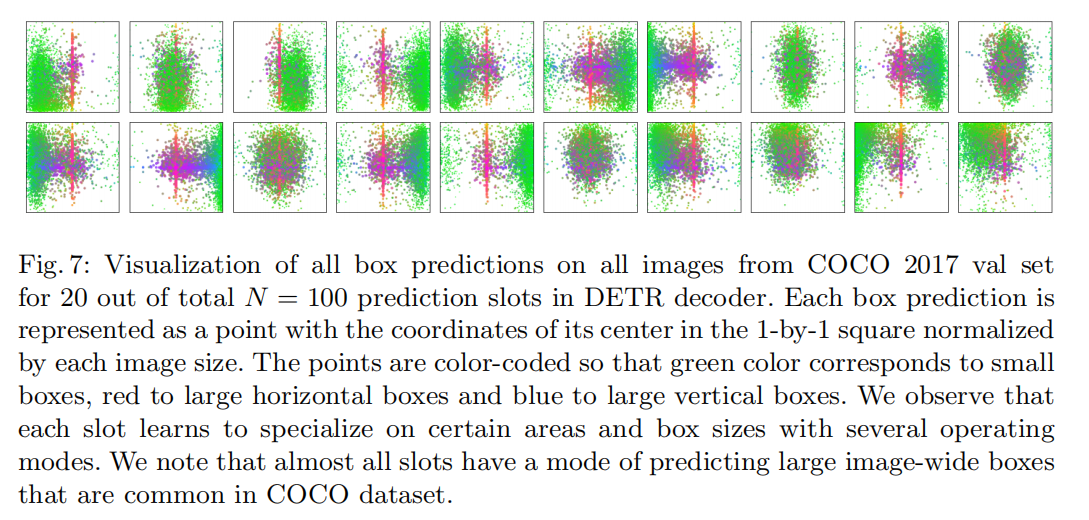To answer this question, the authors perform a fascinating visualization. For each of the 100 output slots (or queries), they plot the center point of every bounding box it predicted across the entire COCO validation set. The points are color-coded by the size and shape of the box.