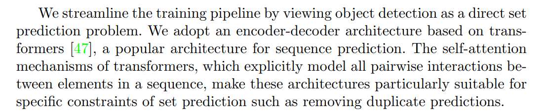 In short, the authors’ central insight is that the global reasoning power of transformers, specifically the self-attention mechanism, is perfectly suited to the task of predicting a set of unique objects. It provides a natural way to enforce the uniqueness constraint without any external post-processing.