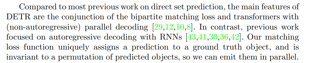 While the idea of end-to-end set prediction wasn’t entirely new, DETR’s approach was fundamentally different from what came before. The authors pinpoint the exact combination of ideas that sets their work apart.