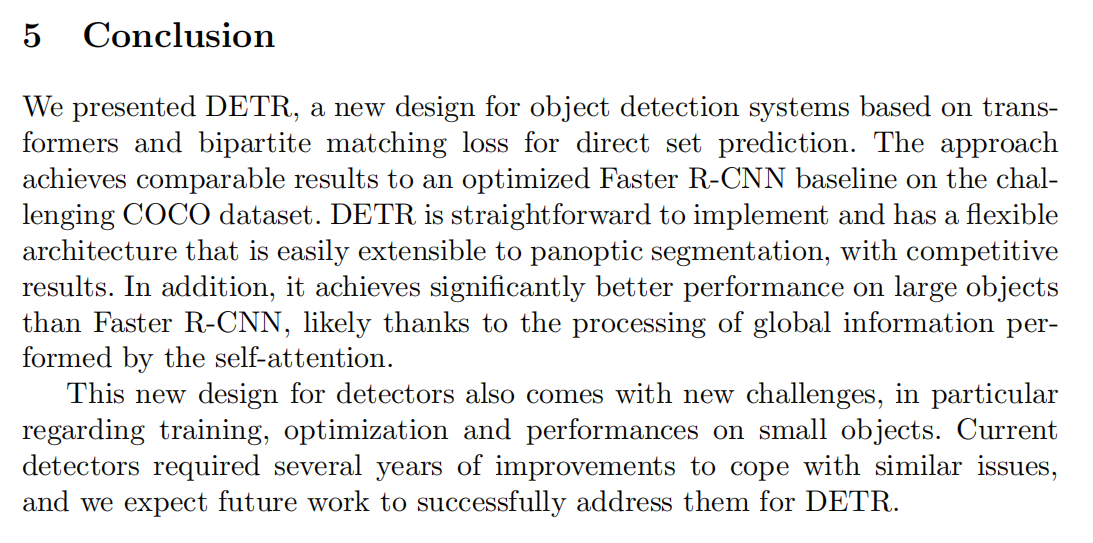 The conclusion of the DETR paper provides a concise and confident summary of the work, while also being forward-looking about the new research directions it opens up.