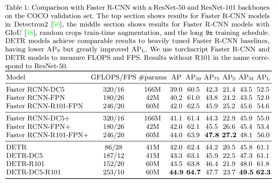 - DETR excels on large objects. The DETR-DC5-R101 model achieves an APL of 62.3, a massive improvement over the strongest Faster R-CNN+’s score of 56.0. This strongly supports the hypothesis that the Transformer’s global self-attention mechanism is superior at understanding and localizing large objects that occupy a significant portion of the image.